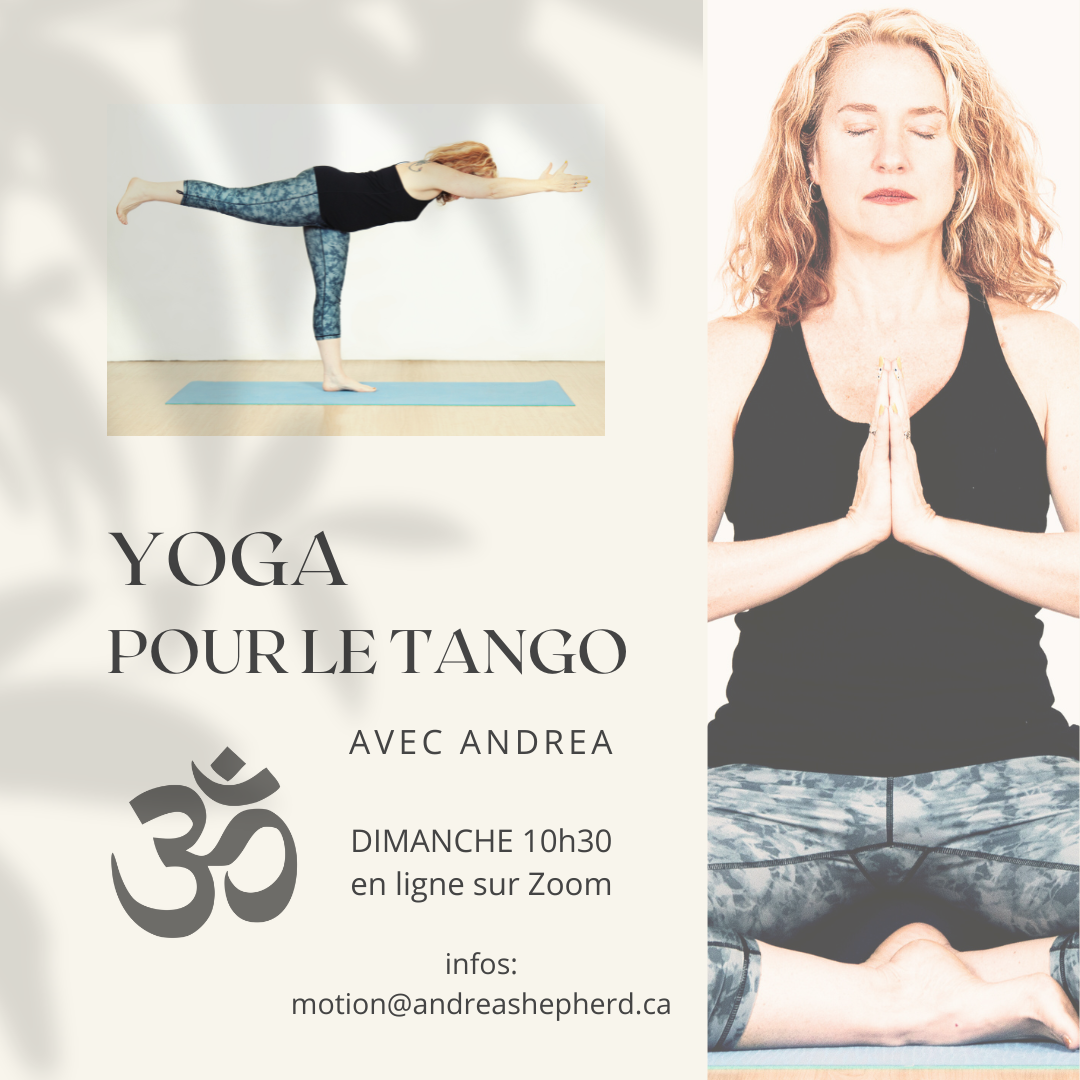 Andrea, a long-time tango dancer and teacher, began practising yoga in 2010, to support her teaching and improve her flexibility. Little did she know it would mark the beginning of a life-changing journey. It has had a positive impact on her posture, dancing, and teaching, as well as how she responds to challenging situations and her overall emotional well-being. In 2015 she met Josephine Vittoria, who became her teacher of choice, mentor, and friend. The following year, Andrea signed up for her first teacher training, with Hervé Blondon of École Satyam. She completed her certification and began teaching in 2017. Since then she has completed over 500 hours of teacher training, with Josephine, Hervé, and their teacher, François Raoult. Their teaching, and Andrea’s, is inspired by the Iyengar method, focusing on correct alignment and using props to adapt the poses to every body. Andrea also specializes in yoga for tango dancers. She teaches at Yoga Essentiel in Montreal, and also offers classes online, with both pre-recorded options and live classes on Zoom. She has also taught at a number of yoga and tango retreats.